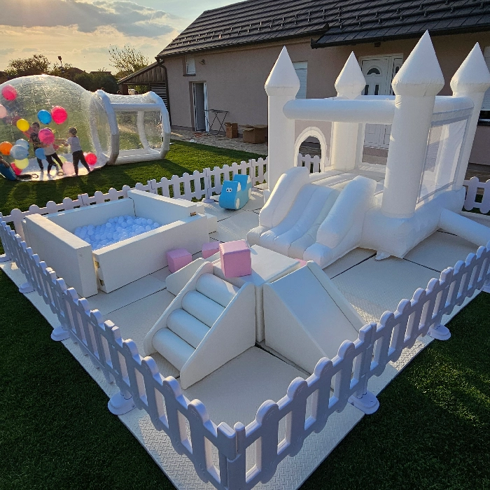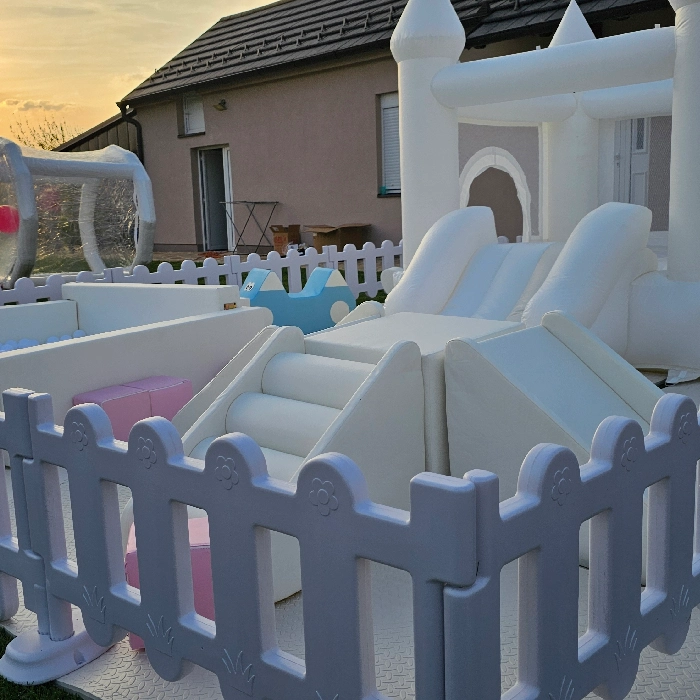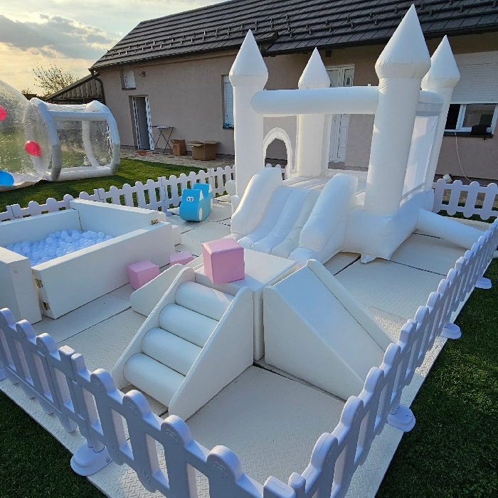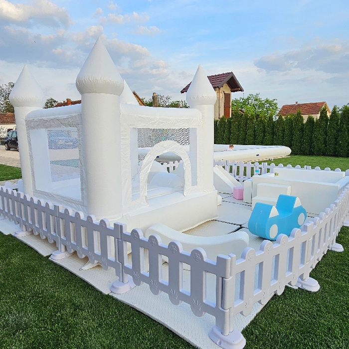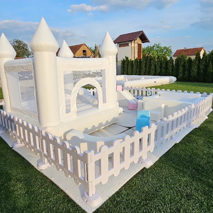 Savršen dodatak za rođendane, proslave i porodična okupljanja! Ovaj elegantni beli inflatabilni zamak dolazi sa kulama i prostranim bazenom punim loptica, pružajući bezbednu i zabavnu igru na otvorenom. Okružen ogradom, idealan je za dvorišta i vrtove, a svojim čistim dizajnom uklapa se u svaku dekoraciju